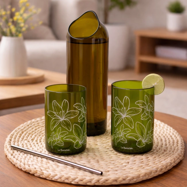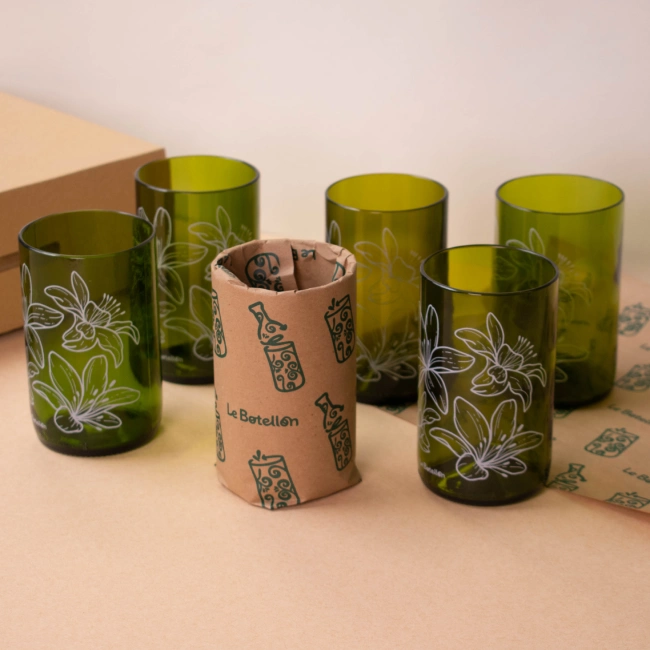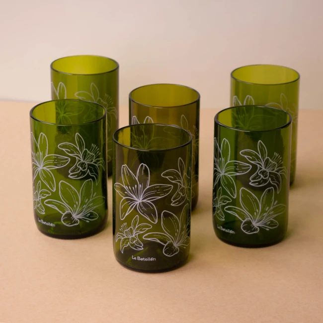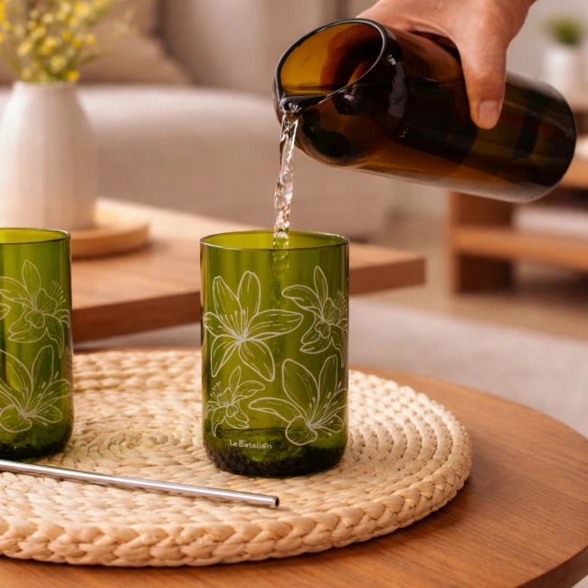 El Vasos Azucena está elaborado a partir de vidrio recuperado que transformamos mediante un proceso artesanal. Cada pieza conserva su esencia original, pero con un propósito más sostenible.