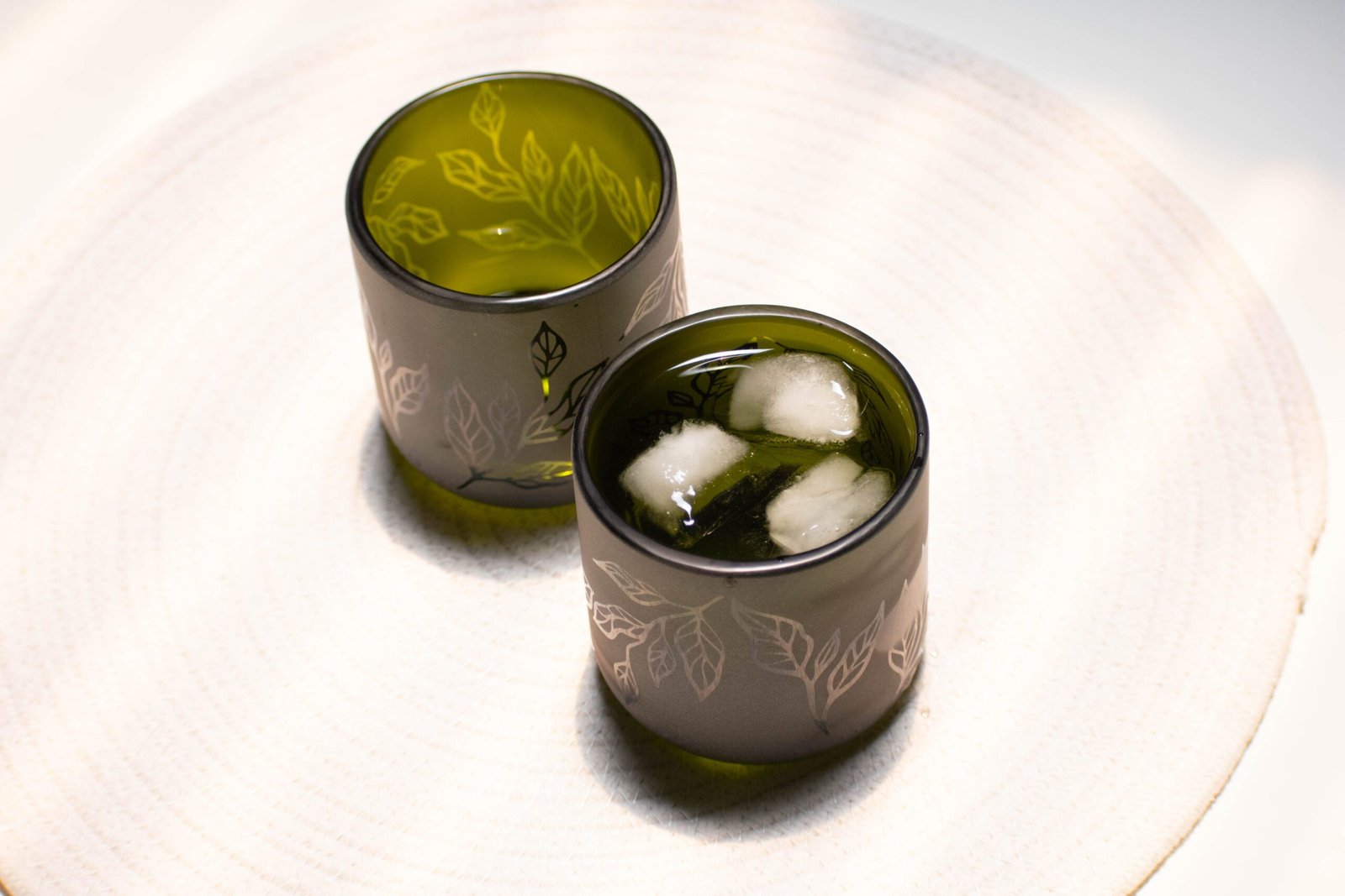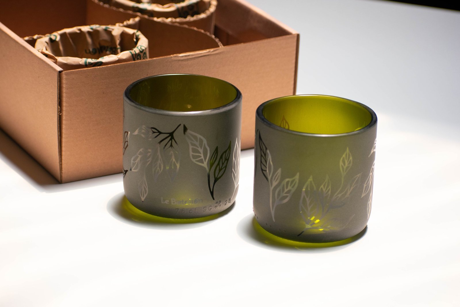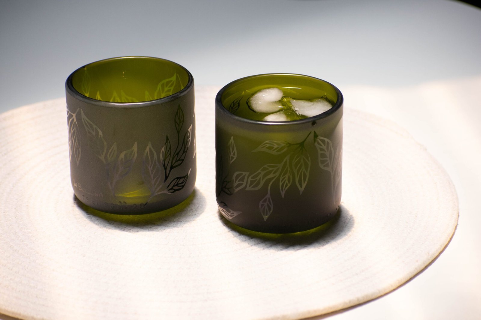 Vasos hechos a partir de botellas de vidrio de champagne de color verde.